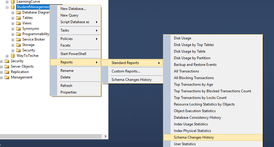 Step 2: Right click the database, go to Reports -> Standard Reports -> Schema Changes History.