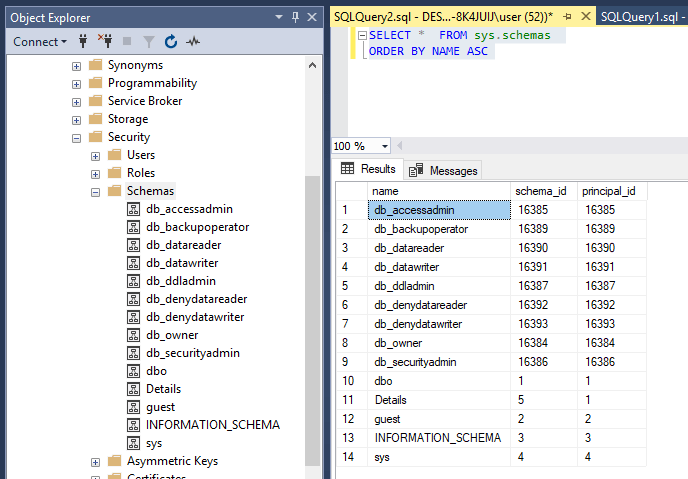 The second method is listing using T-SQL, we can get the complete list from the table sys.schemas.