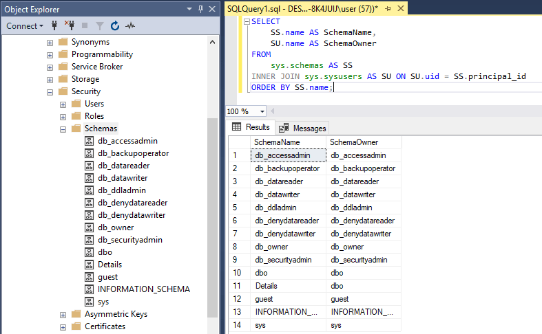 When the above T-SQL is ran in the Query window, we will get the Schema Name and corresponding Schema Owner as the result columns as shown,
