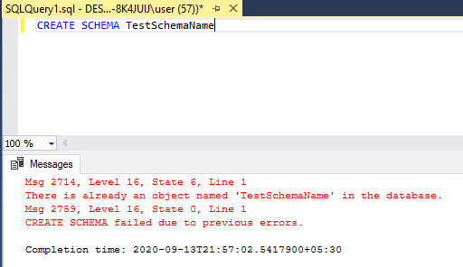 So, what happens when we try to create a schema which is already exists,?. Let’s try that to, once again if we run the Create Schema T-SQL, we encounter the error as mentioned below,