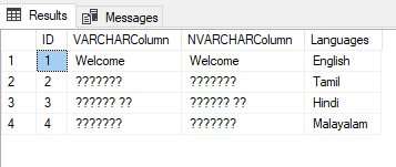 We could see that still the non-English Characters column values (NVARCHARColumn) are not converted into Unicode values even though the datatype is NVARCHAR(). The reason is because, we also need to specify N while inserting the values into the table. As I said before, N stands for Unicode.