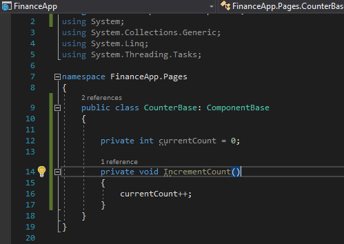 In order to access the Counter Class members in the razor component (View File), we need to make Counter Class as Partial Class. At the compile time Partial Class and generated partial class of the razor component (view file) will be combined, so that the Properties and Methods in the class file will be available to the view file.