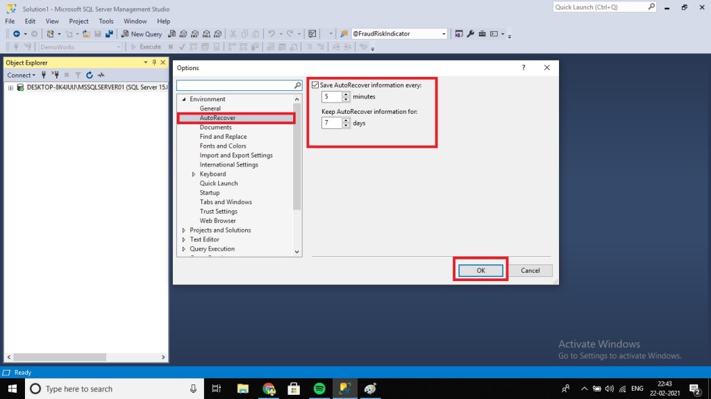 By enabling the Auto-Recover, we can recover our unsaved SQL Scripts. All we have to do is, navigate to Tools -> Options -> Environment -> AutoRecover