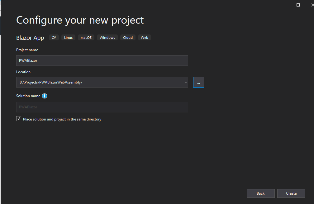 - In the next step choose Blazor WebAssembly App, from the option. In order to create PWA, we need to choose Blazor WebAssembly App, since PWA always does not have a server. We also need to enable the Progressive Web Application as shown in the below. By enabling, it will turn our Blazor WebAssembly Application into Progressive Web Application.