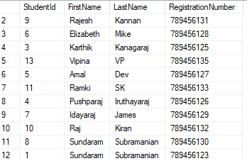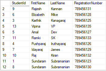 If we look into the result rows, 8th and 9th rows last three characters are same and also it is same for 11th and 12th rows. So in this scenario, we have to again apply Order By for StudentId column. Basically f two or more students both have names ending in the same last three characters (i.e.: “Bobby”, “Robby”, etc.), secondary sort them by ascending StudentId.