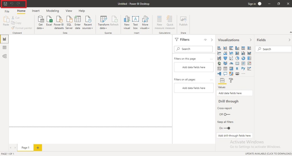 Lets get into the deep introduction of Power BI Desktop. The Fig.1 shows the overview of the Power BI Desktop. On the top left corner we can see some icons as Save, Undo and Redo which are quick accessible tool bar in the Power BI.