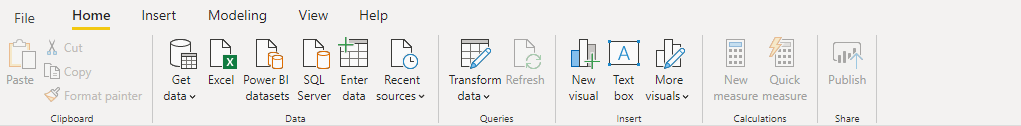 Just below the Quick Tab, we can see options as File, Home, Insert, Modeling, View, Help. These are part of Ribbon Tab in Power BI Desktop. Each options have some sub options as well, which we will learn more in detail later part.