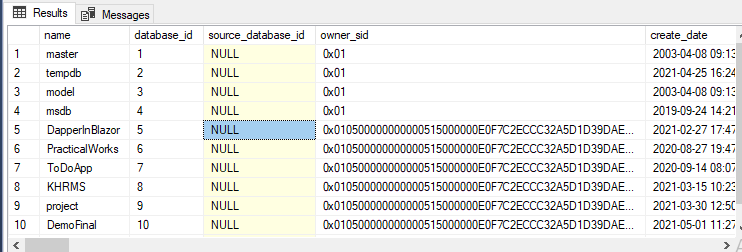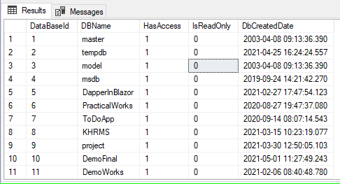 Now we have to check does the user has access by applying the function HAS_DBACCESS. It returns 1 if the user has access to the database, 0 if the user has no access to the database, and NULL if the database name is not valid. When this function returns 0 that it also means that the database is offline, single-user mode, or any other issues that are preventing us to use the database.
