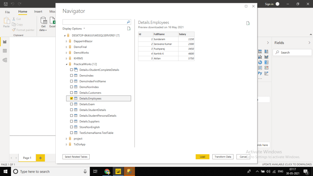 Once after connected, it will open a new window to choose the database and to choose the table. As an example I am choosing the PracticalWorks as my data and Detail.Employees as our table for preparing the dataset.