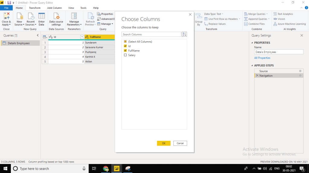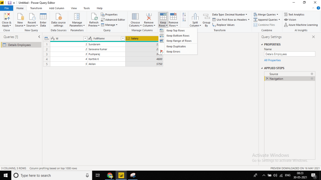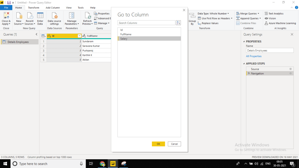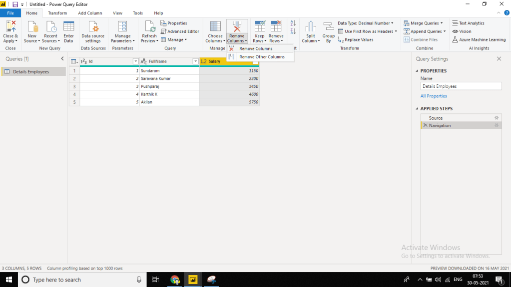 Now let’s choose Remove Column and Salary column is removed. If we look into the Applied Step on the right side of the screen, a new step is added.