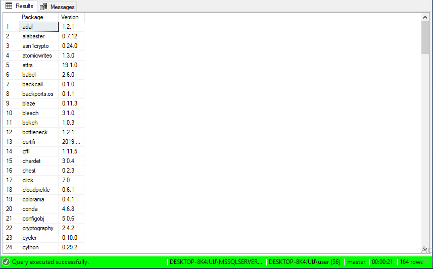 From the above statement, pkg_resources contains the information about the Python packages and we are looping it get details of each packages. i.key in the for loop holds the information about the Package name and i.version holds the information about the version. And the T-SQL Statement results as,