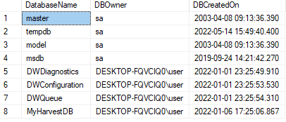 The created database details are stored in sys.databases table, and the owner_sid column holds the owner details in binary format, we need to convert it to result in Characters and the suser_sname function converts it. The above T-SQL Statement results as,