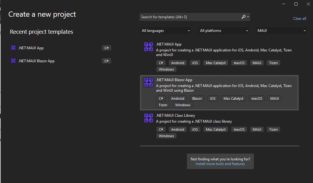 - .NET MAUI has three categories, .NET MAUI App, .NET MAUI Blazor App, .NET MAUI Class Library