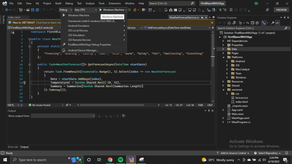 This project also has similar options to .NET MAUI App, to export the application to multiple platforms. Let’s Run the application for Multiple platforms