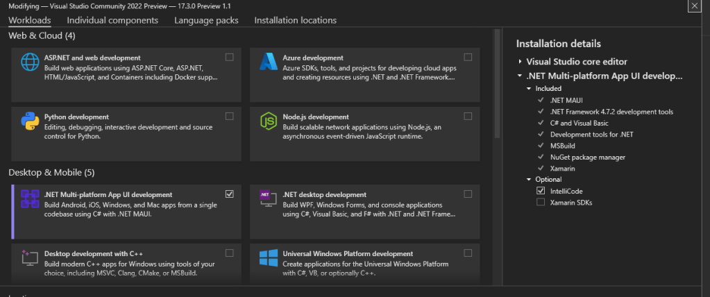 Once downloaded and installed, choose .NET Multi-platform App UI Development Workload from the list shown below.