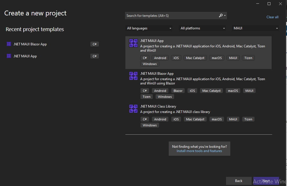- Choose to .NET MAUI App from the Project Template options and click Next