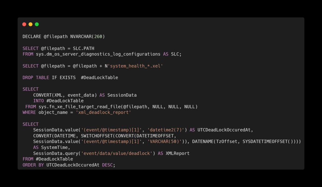 By utilizing the T-SQL script provided below, we can generate a list of sessions that experienced deadlocks, along with the timestamp of each occurrence